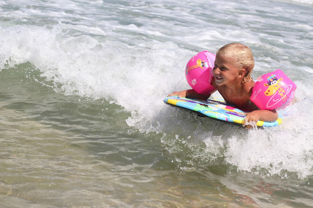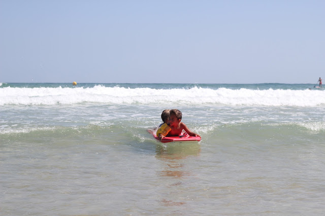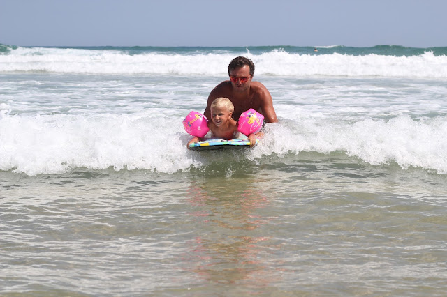 Uma das coisas boas, há sempre uma cara conhecida e alguém cheio de filhos para elas brincarem e fazerem amigos. Fizeram bodyboard em pranchas emprestadas e a Caetana foi a revelação...para o pai esta ainda vai ser "a" surfista da casa. O pai fez surf com ondas boas e grandes (coisa tão rara no Algarve que o deixou com um sorriso gigante na cara).