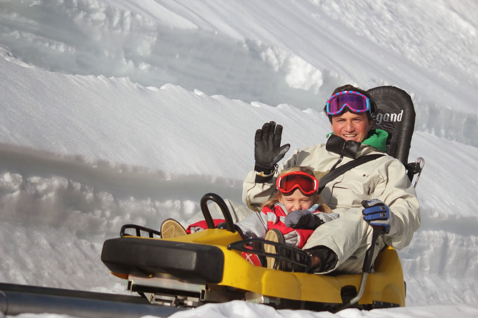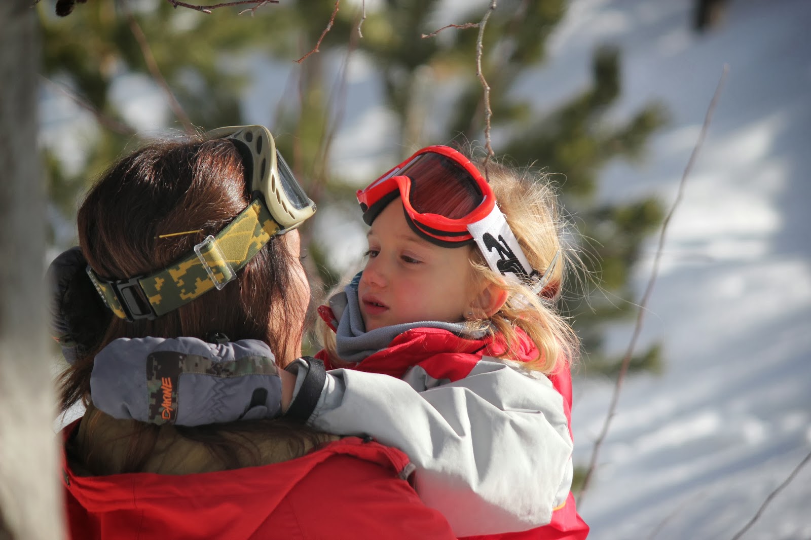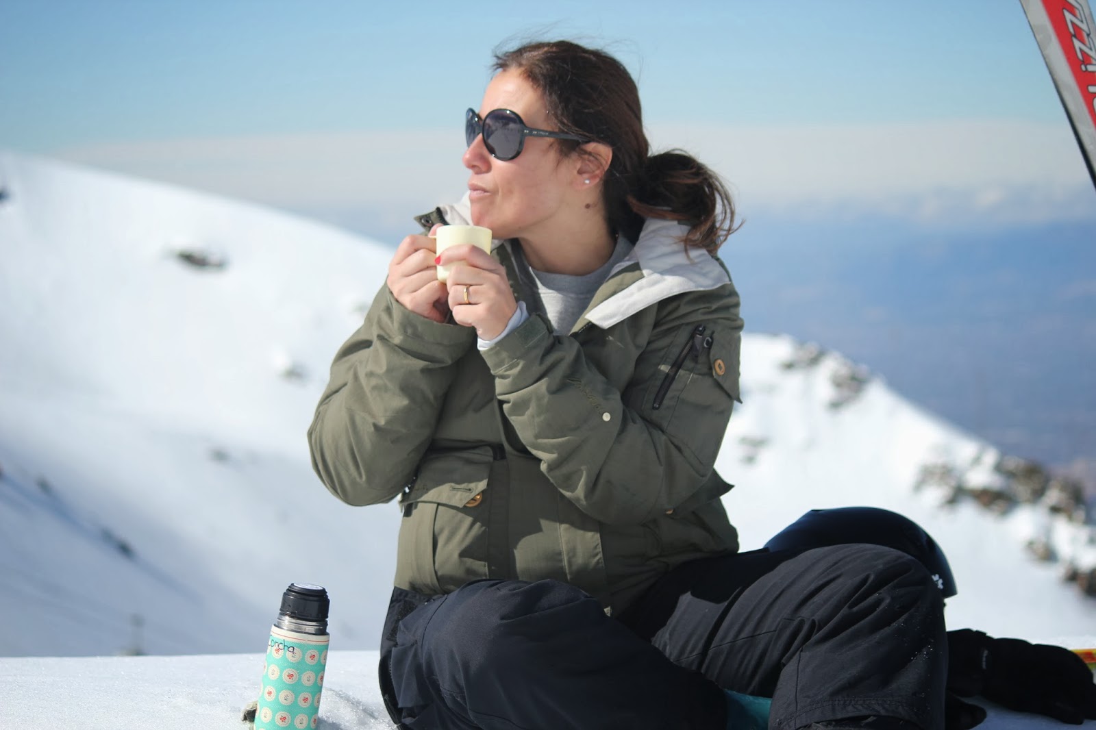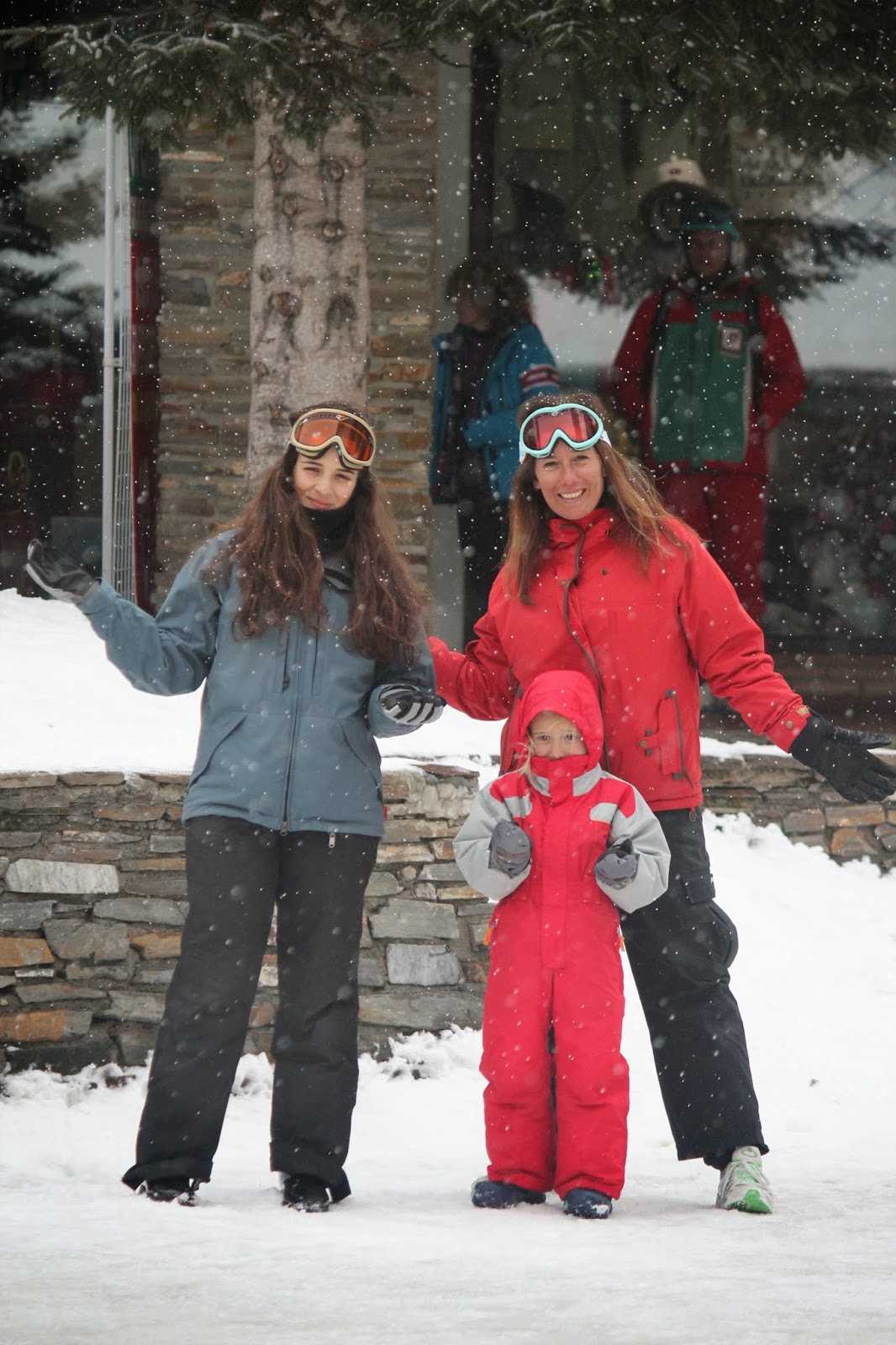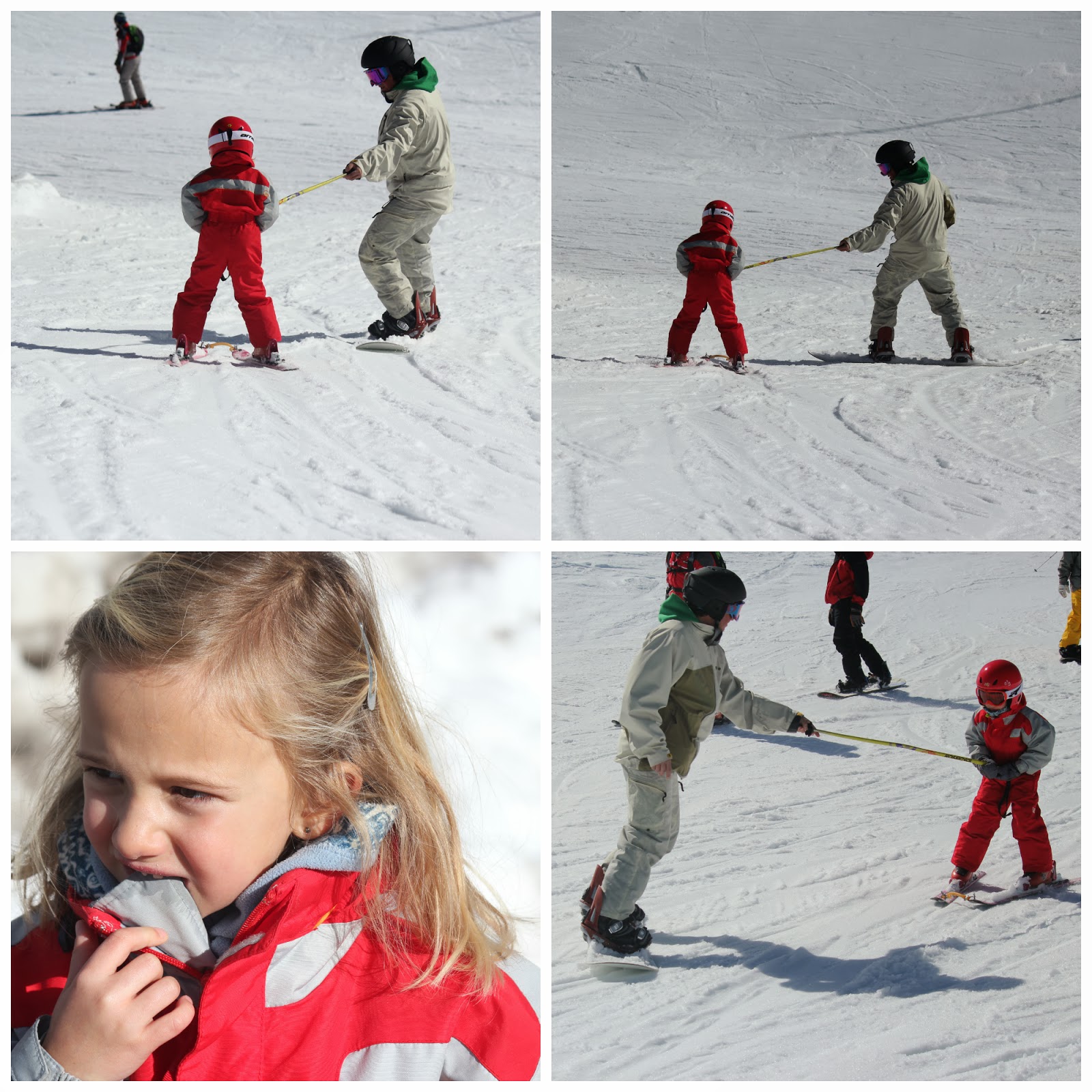 Para o dia, o fato completo, foi a solução que achámos melhor e mais confortável, para que quando estivesse a brincar, caísse ou simplesmente estivesse sentada na neve, não se "esbarrigasse" e entrasse algum frio ou mesmo gelo, coisa que por vezes acontece se a opcção forem calças e blusão. Roupas giras não faltam para todos os gostos e todas as carteiras. Muitas são as marcas, que já têm roupa de neve para os mais pequeninos, e lindas de morrer. O fato da C. grande era da Decatlhon, do ano passado, comprado em saldos e a um preço fantástico. O encarnado fica-lhe bem e na neve é uma cor que se vê e não passa despercebida. O capacete, foi presente da avó, e foi comprado no El Corte Inglês. O uso do capacete, é cada vez mais obrigatório, as crianças então, está fora de questão, não usar.