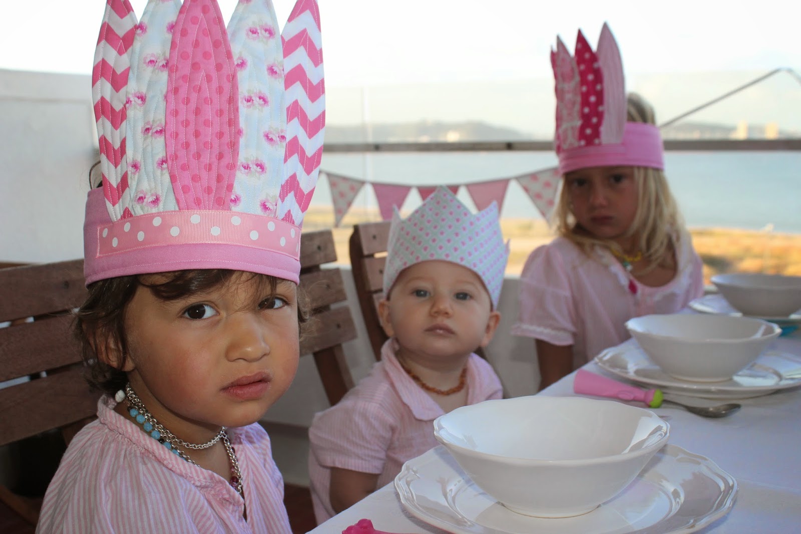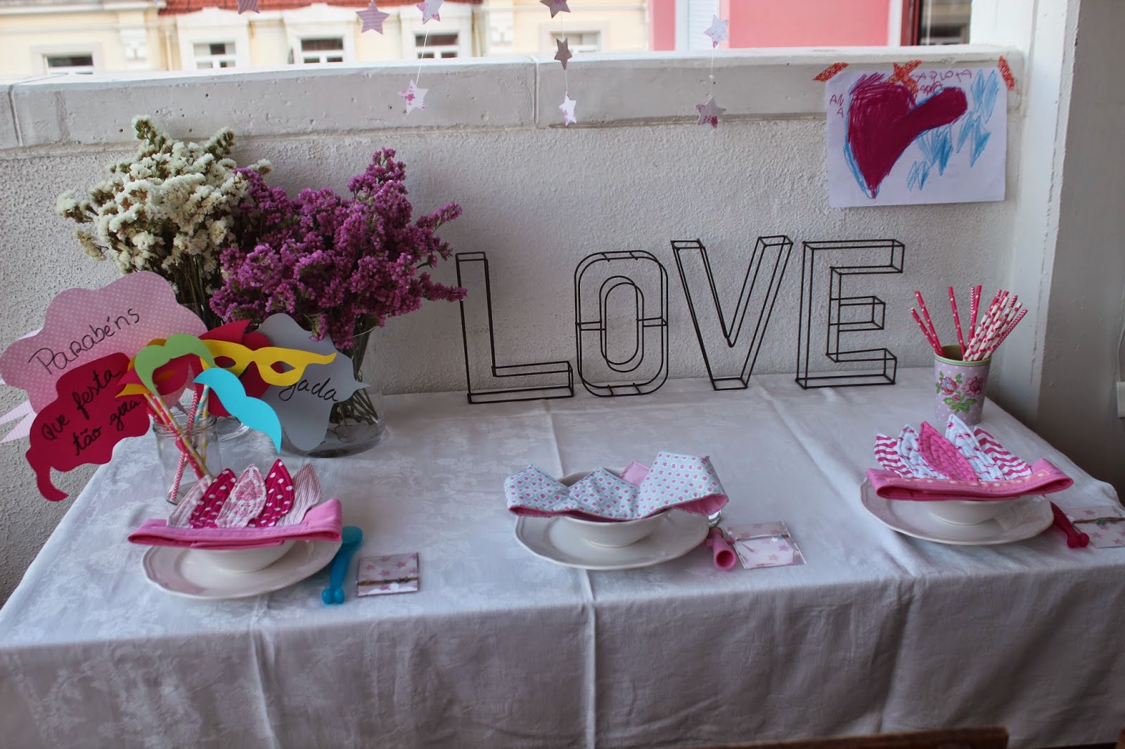 Quis preparar uma surpresa para este dia, uma mesa bonita para o p. almoço, com muito cor de rosa e cheia de amor e carinho. Apesar de não haver muito tempo, por ser dia da semana, o p. almoço é a refeição que mais gosto e que faço questão de tomarmos todos em família. Nem sempre dá, mas neste dia tinha de dar e tinha de estar tudo bonito, como eu achei que elas iam gostar. Cortei estrelas, imensas, em vários papeis girissimos, todos em tons de cor de rosa, a cor preferida das meninas, comprados no Atelier da Tufi, a quem agradeço algumas ideias e ajuda. Depois o resto, foi com a ajuda do H, fizemos várias grinaldas que penduradei no tecto da varanda. A estrela grande, do Ikea, não é só usada no Natal, e deu um toque especial. Flores, as de sempre, as que uso e abuso em quase todas as ocasiões, porque duram e fazem arranjos bonitos, também cor de rosa e branco a cor da festa. Um desenho que amo, feito pela Carlota, as letras da Area, a dizer Love, as bocas, bigodes e óculos, para tornar o momento divertido e os presentes especiais para as três, compunham a mesa do P. almoço. A Caetana, a rainha da festa teve a sua coroa especial digna deste dia, as manas, as de índio, em vários tons de cor de rosa, as três do Atelier da Tufi, uma loja que elas são fãs.