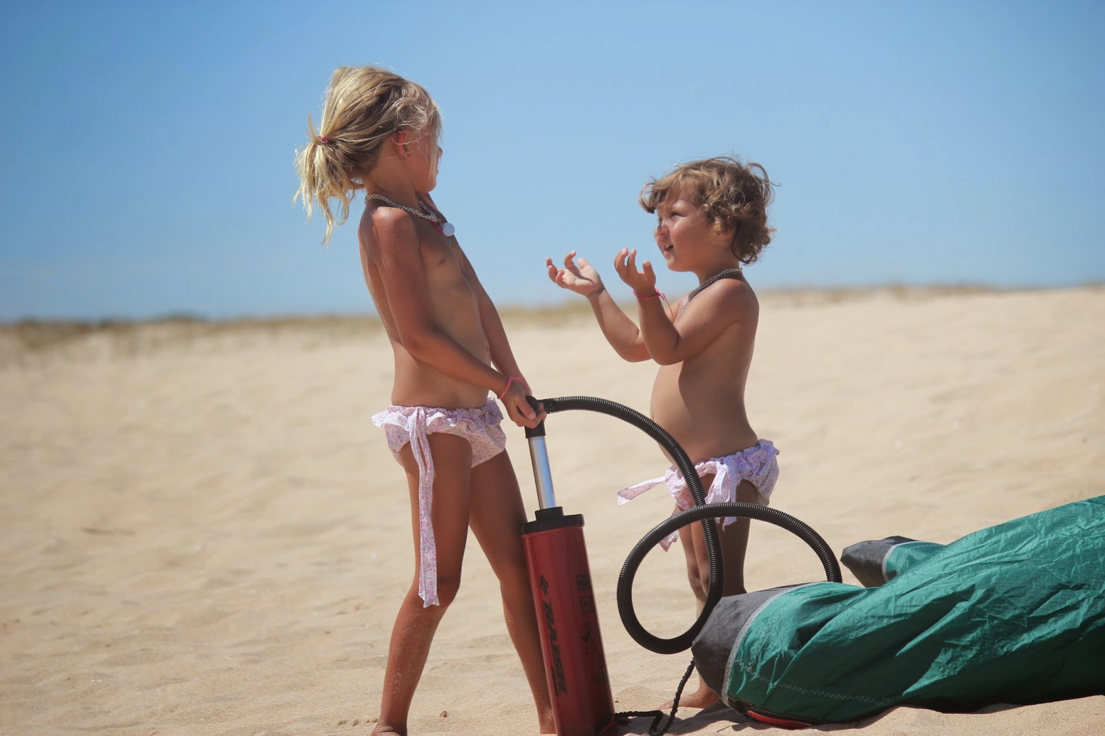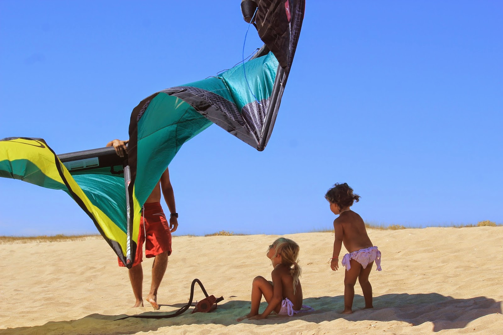Este ano, resolvemos mudar de estratégia (normalmente chegamos, paramos o carro e só voltamos a entrar nele no dia do regresso). Fomos descobrir novas praias, não muito longe, sem tantas pessoas (este é um senão que o nosso Inverno rigoroso fez, praias muito mais pequenas, logo muito mais cheias, sem tanto espaço para estender a toalha), onde o pai conseguiu fazer Kite surf e ter a nossa companhia, porque o vento que estava era tão quente, que não incomodou nem um bocadinho. Fomos dois dias para o Alvor (mais ou menos a 30 minutos do hotel), para uma praia que parecia só nossa. Valeu a pena os cerca de 15 minutos que temos de andar junto à ria, pois a paisagem é linda e a praia que temos só para nós é das mais giras que já estive, naquela costa algarvia. Juro que vale a pena a caminhada.