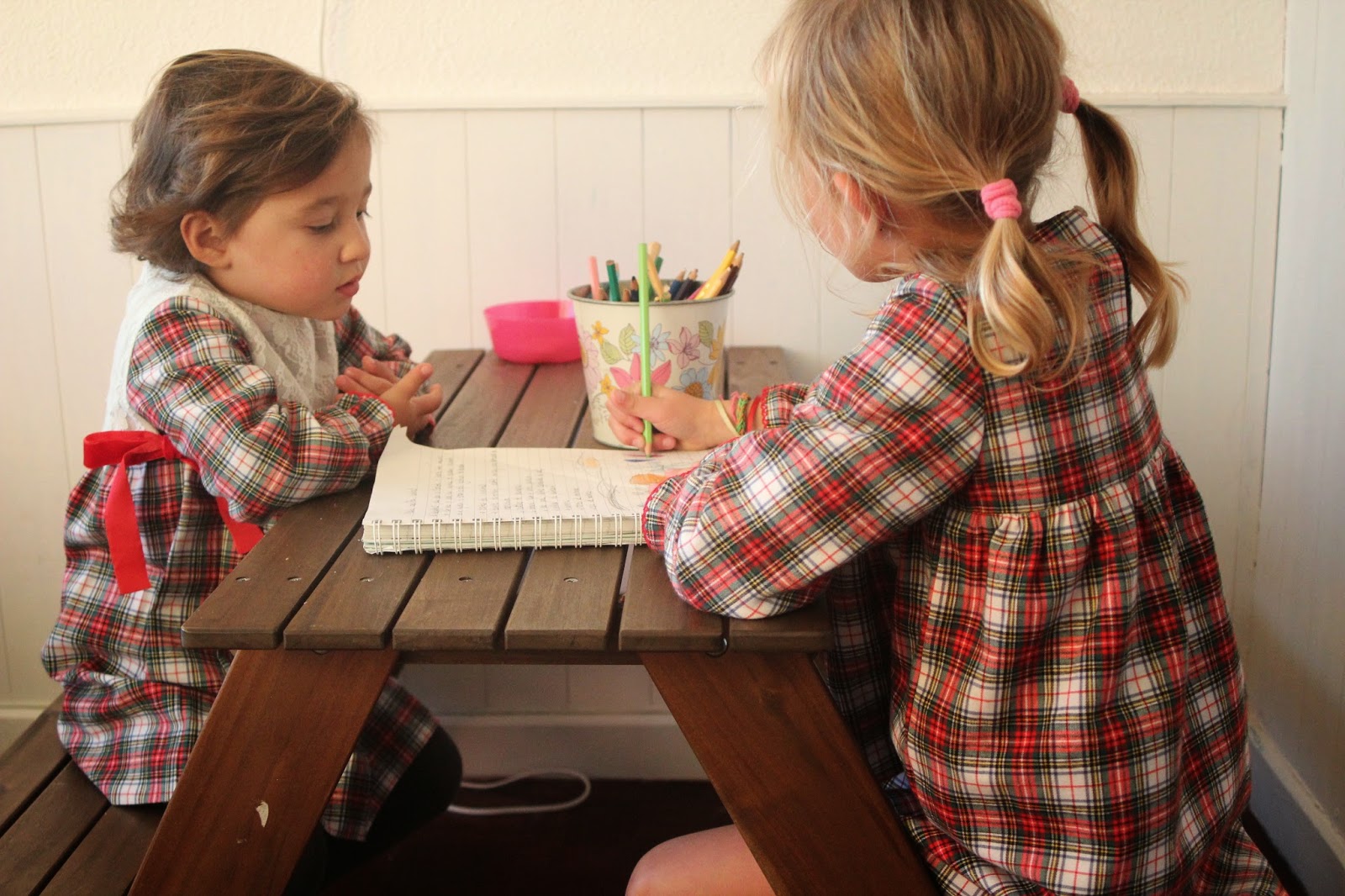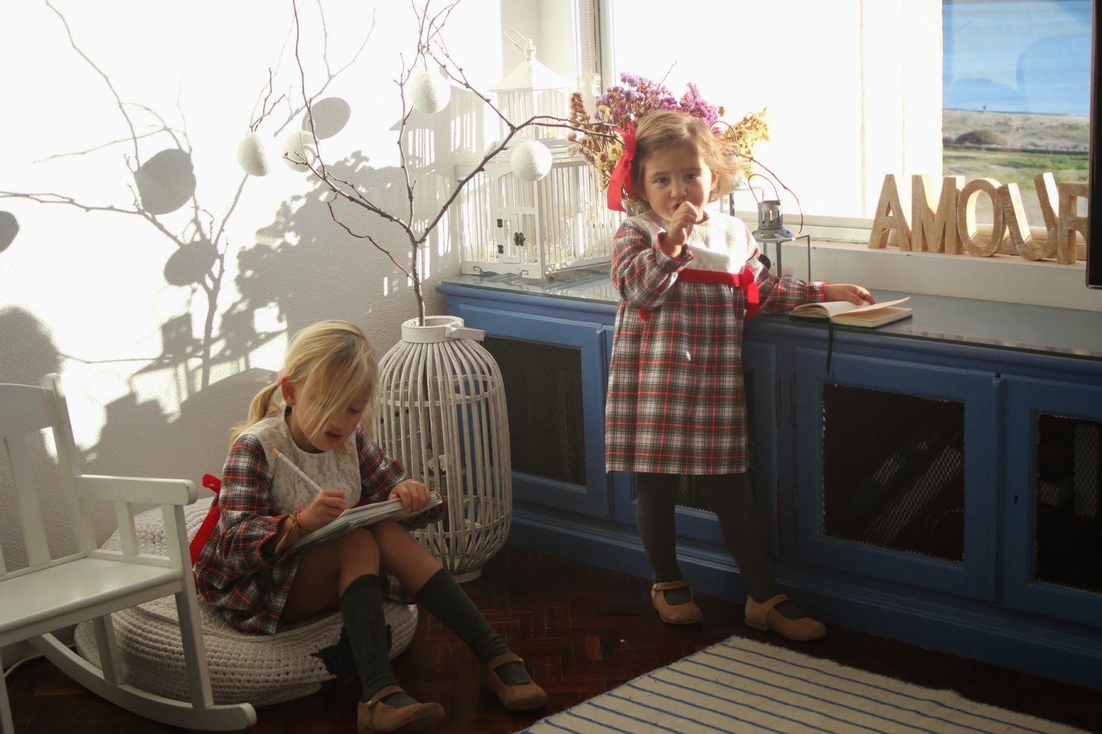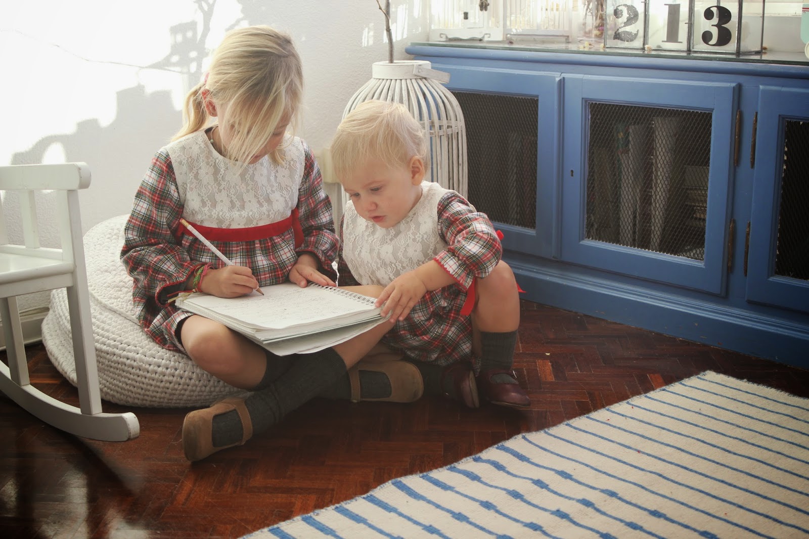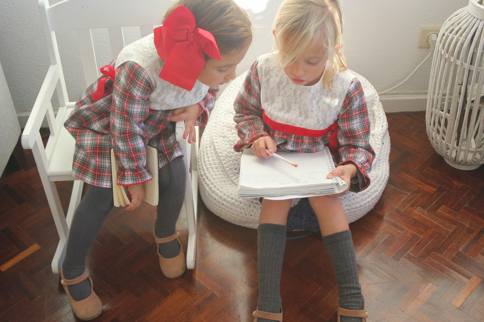 Mas não restaram dúvidas sobre o que foi a coisa que mais gostaram, o que as deixou felizes, envergonhadas e um tanto emocionadas, pois até este ano nunca nenhuma tinha escrito a carta ao pai Natal. Desta vez fui eu que dei a ideia da frase (simples e sem grandes trabalhados para que percebessem o objectivo), que escrevi e ouvi o que cada uma quis pôr nos seus desejos de presentes para este ano. Amanhã carta no correio e lá vai ela a caminho da Lapónia, direitinha para a casa do pai natal. As perguntas de quantos dias demora a chegar, se ele vai perceber a letra, se ele sabe ler, se, e se, e mais de mil se, foram a conversa entre elas o resto da tarde. Até um kit especial elas acharam graça vestir, para que a magia deste momento tivesse mesmo sabor a Natal, um sabor muito especial, principalmente, para as duas mais velhas. Ficaram tão, mas tão queridas com o vestido de xadrez da Little Angels que a máquina fotográfica teve de trabalhar. Adorei o pormenor da renda que pode sair, ficando um vestido e fofos mais normais, que podem ser usados em qualquer ocasião. A C. pequenina que cortou o cabelo e ficou com um ar muito mais menina, estava deliciosa com o laço encarnado. Porque a minha cor para quase tudo este ano é o cinzento, as meias e collants foram dessa cor que mais uma vez provou ficar giríssima com encarnados e com Natal. Uma sugestão muito gira que ainda vão a tempo de comprar.