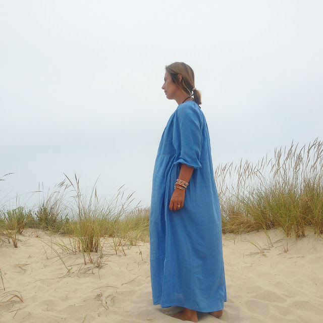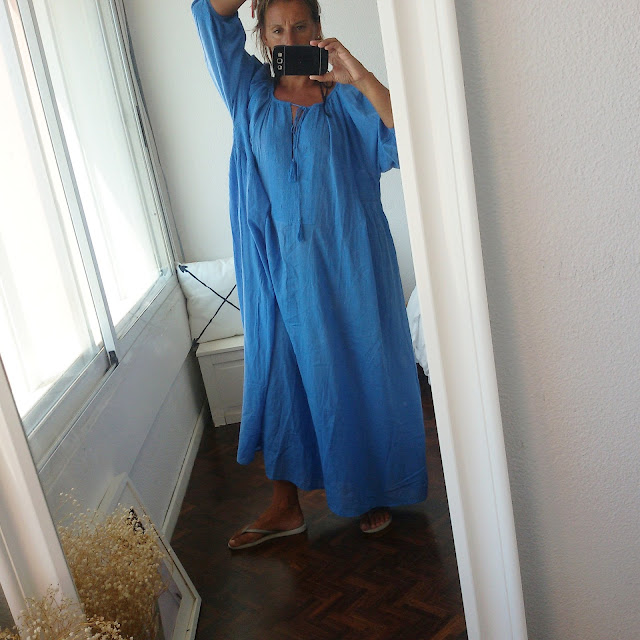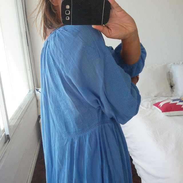 Sou completamente fã de vestidos compridos, largos e fluidos. Sou doida por kaftans no Verão para a praia, ideais para um almoço tardio à beira mar, para um copo na esplanada ao final do dia e para mim, ficam giros que se farta a magras e a menos magras. Quando cheguei à Oysho pronta para me perder nos saldos e vi este Azul fiquei apaixonada. A redução do preço não era extraordinária, mas comparando com preços de outras marcas para este tipo de peça, era bem mais baixo e acessível, por isso foi directo para a caixa sem passar nos provadores. Tinha a certeza que ia ficar giro, que ia ficar como eu imaginei e não me enganei. É muito largo, mas eu gosto assim. Era aliás um destes que procurava faz tempo e não encontrava. Tem pormenores lindos bordados e foi dos meus primeiros achados destes saldos de Verão.