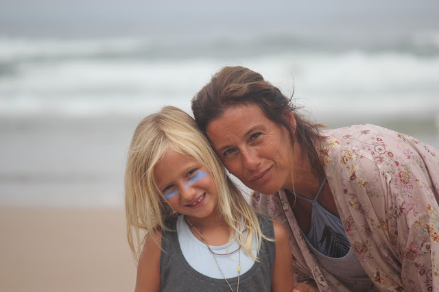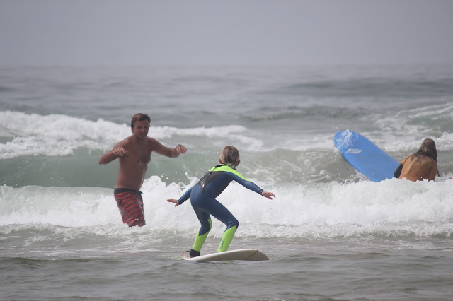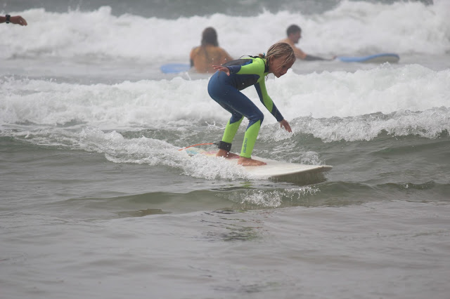 Neste dia, a nossa surfista ia ainda mais radical, com a sua pintura guerreira na cara (uma ideia gira para protegê-los, são protectores solares com cores giras que eles deixam pôr o dia todo sem refilar) e desta vez o registo da aula com o pai ficou para mais tarde recordar.
