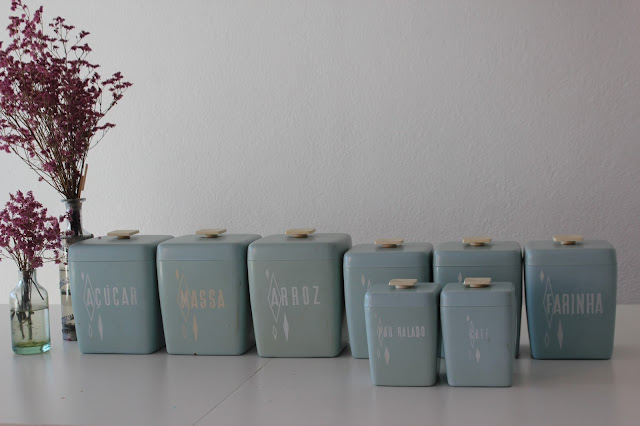 Como boas ideias de arrumação são sempre bem vindas o conjunto de caixas de cozinha vintage (que ficam o máximo também no quarto dos brinquedos com lápis, plasticinas e outros materiais) que vou vender por falta de espaço (com muita pena minha que os adoro de paixão, mas já não aguento a voz do meu marido nos meus ouvidos a dizer que não tem espaço para fazer o seu gin, cortar os legumes, etc, etc).