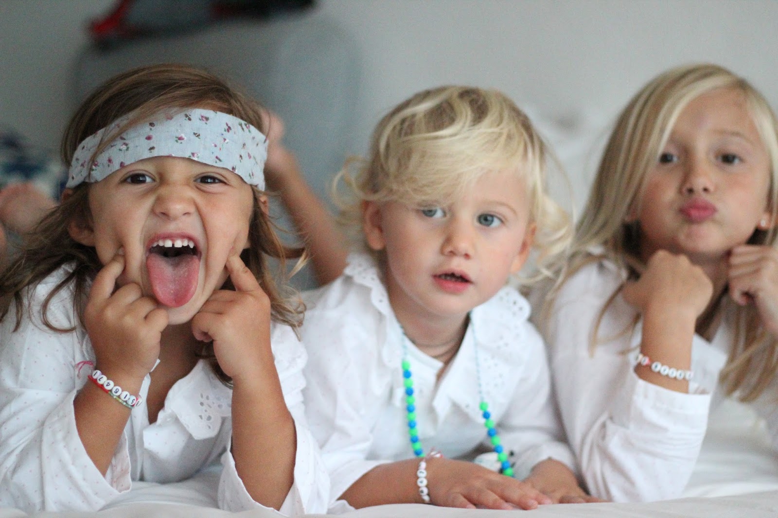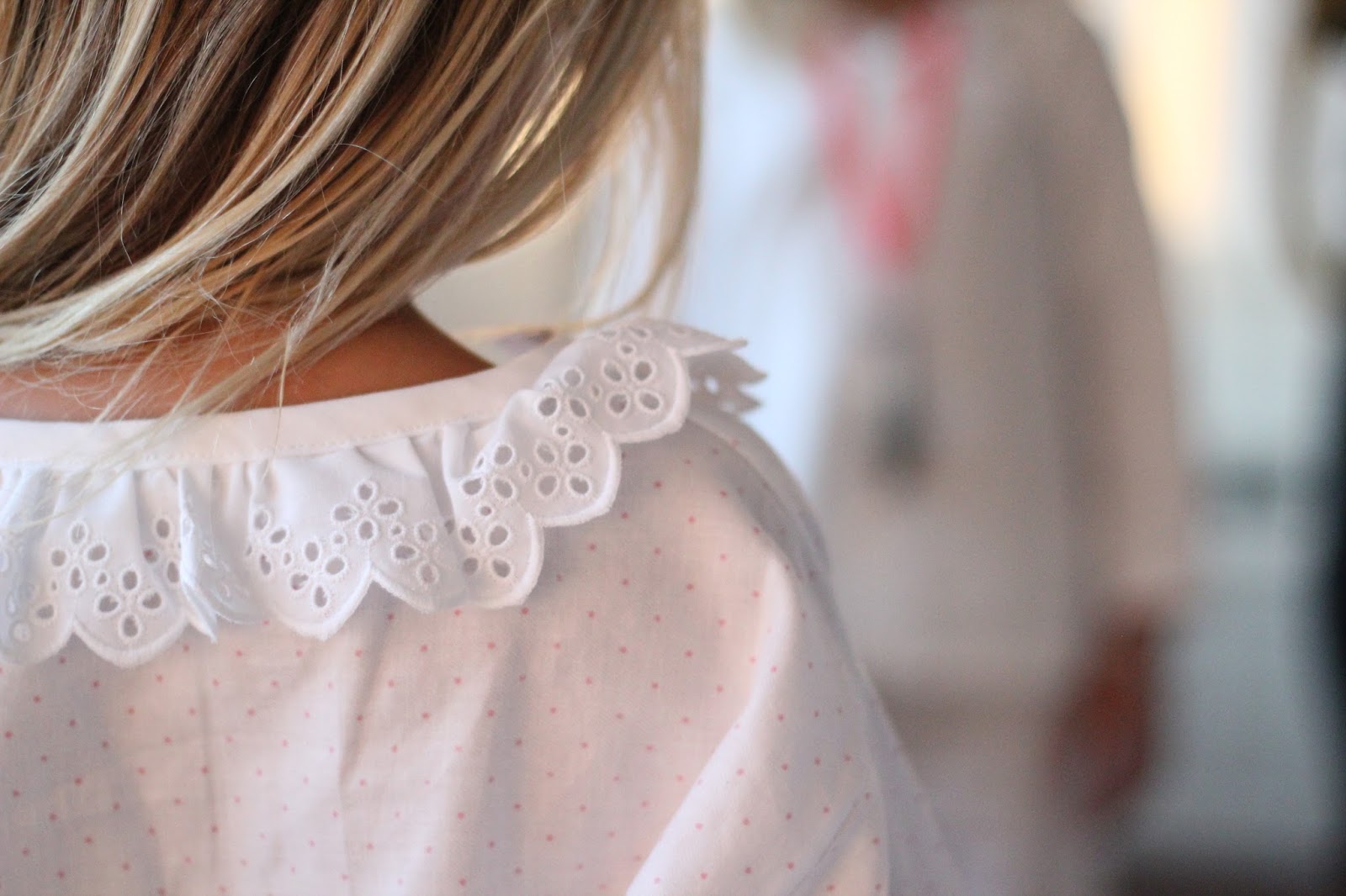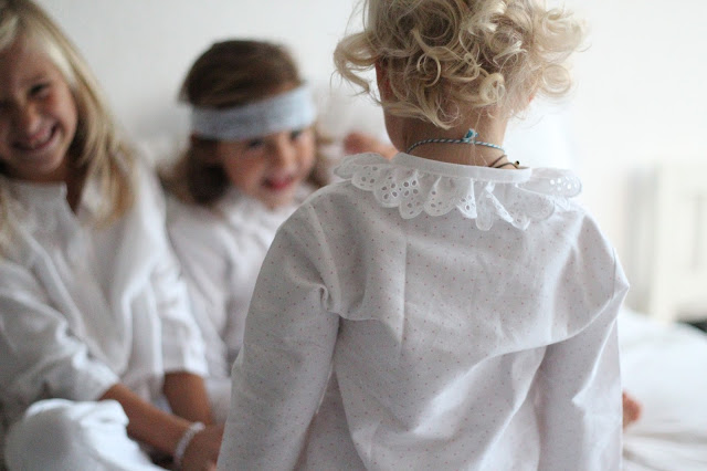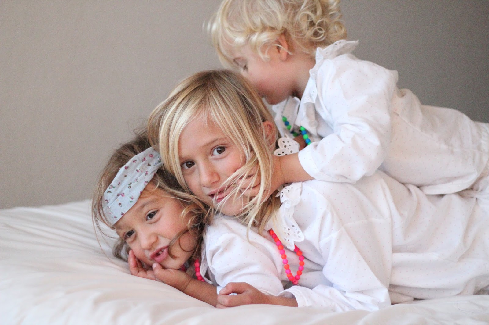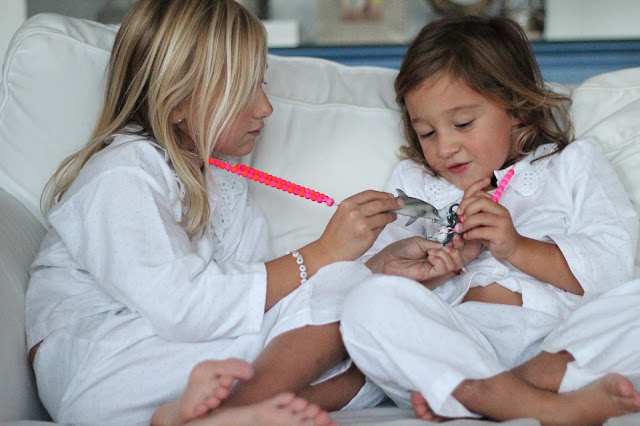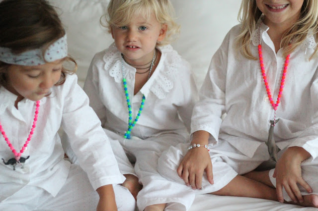 Estes pijamas, da Bubble babywear, são um amor, com uma gola bordada mesmo muito bonita que, ainda as faz parecer, miúdas mais queridas e os colares da Safary Family (à venda no Atelier da Tufi) são uma perdição para elas que querem TODOS, e passam horas a fazer histórias com os animais. A fita "radical" que Concha tem na cabeça, é da Mmi storese ela gosta é de usá-las assim.