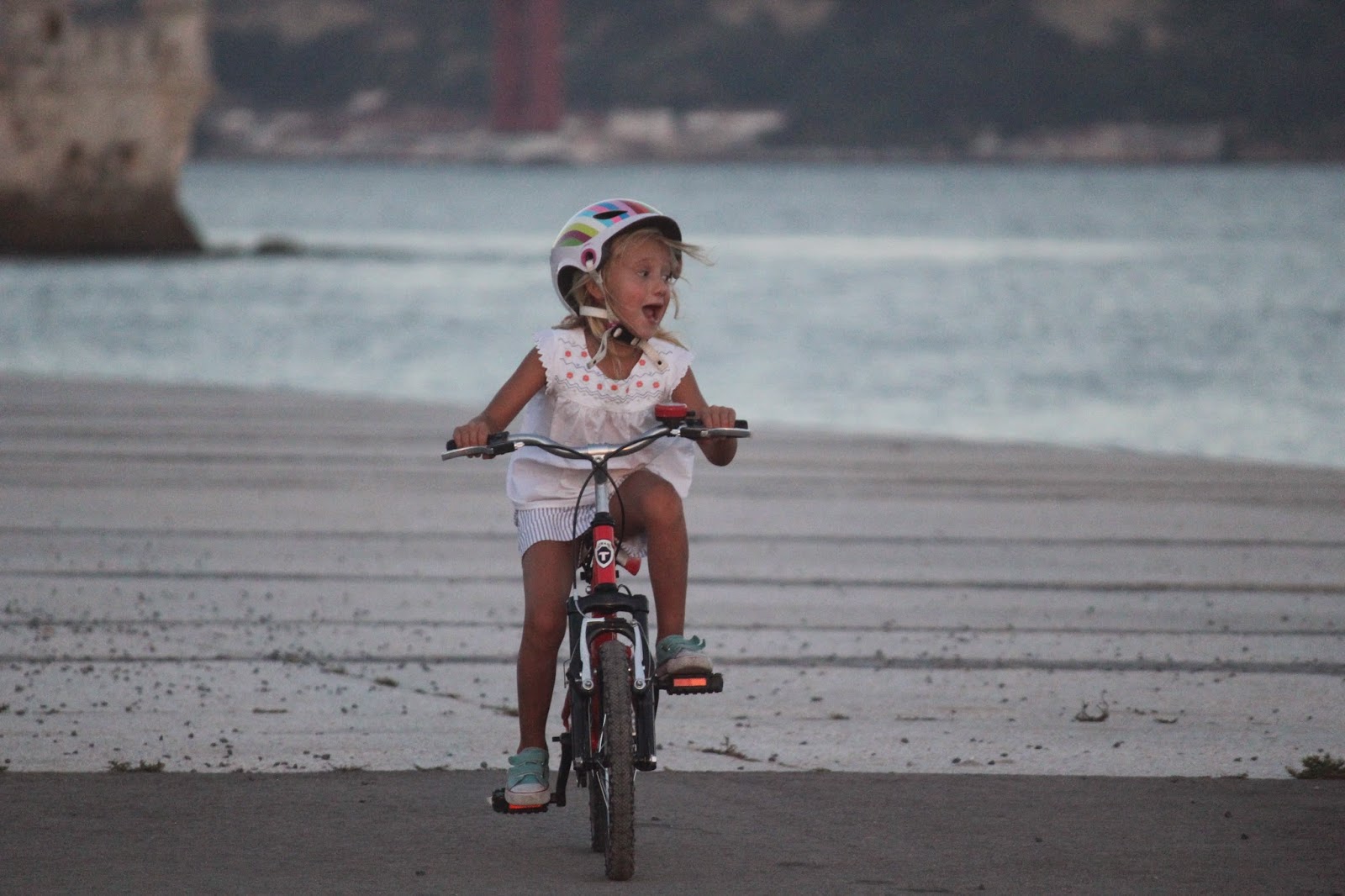 O H. escolheu um sítio bem largo, com muito poucas pessoas e com bastante largura para me habituar. A bicicleta ajudou de tão confortável que é e depois de uns "ss" e uns saiam da frente, lá me habituei a travar, lá consegui pôr os pés no chão sem sair cambalhota, usei umas três vezes as mudanças e se fui contra um muro, foi apenas uma vez, pois a cara que a Carlota fez foi tão: